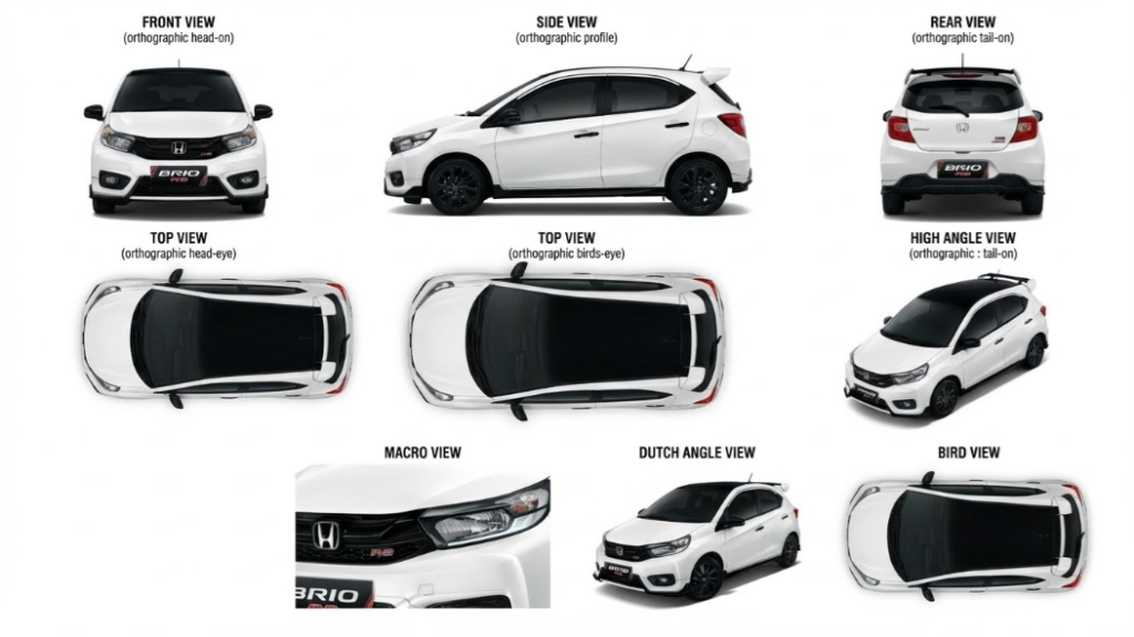| Semua Sisi (Grid) | [Nama Objek] reference sheet, consisting of front view, side view, rear view, and top view, orthographic style, white background |